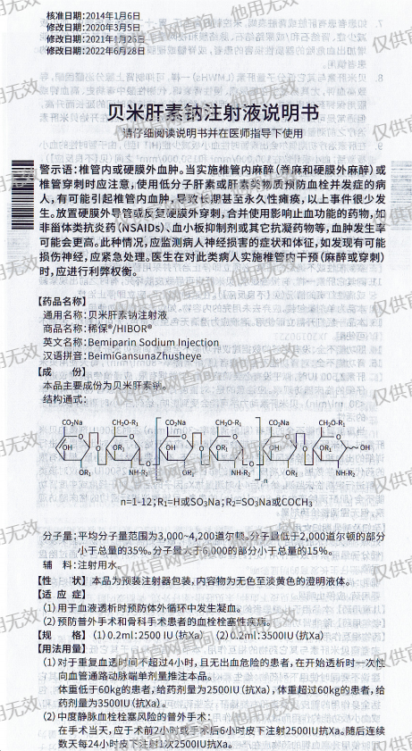 (1)對于重復血透時間不超過4小時,且無出血危險的患者,在開始透析時一次性其向血管通路動脈端單劑量推注本品。體重低于60kg的患者,給藥劑量為2500IU(抗Xa),體重超過60kg的患者,給藥劑量為3500IU(抗Xa)。